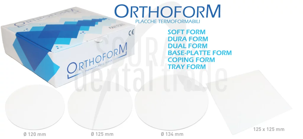 Le placche termoformabili OrthoForm sono fogli termoplastici rigidi o morbidi, utilizzati in odontoiatria per diverse applicazioni come mascherine per lo sbiancamento, bite per il bruxismo, applicazioni per l’ATM (articolazione temporo-mandibolare), mascherine di contenzione e altro. Sono disponibili in diversi materiali, tra cui polietilene tereftalato (PET) e etilenvinilacetato (EVA).